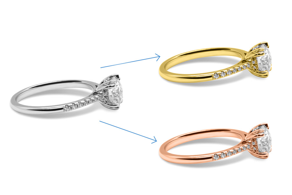 Metal color changed digitally between silver, gold, and rose gold to showcase multiple product variations without reshooting. Ideal for presenting different finishes in catalogs and online stores.